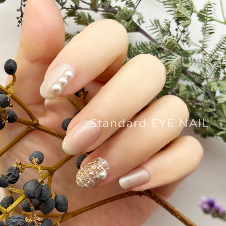 全体的に淡いベージュカラーで落ち着いた印象に♪でも、大きめのパールで存在感もあります!